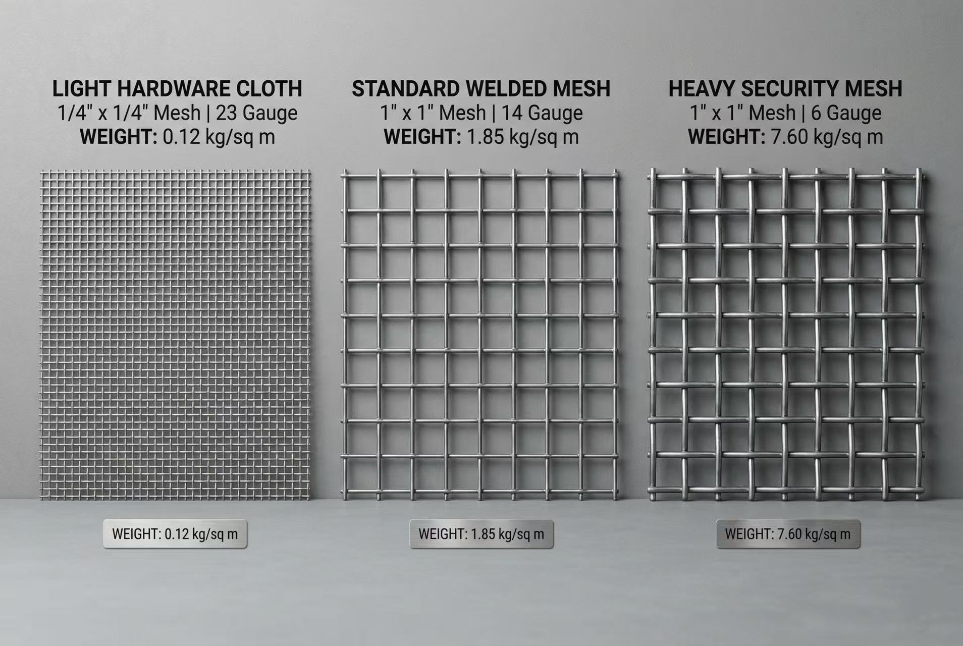 Dove: diametro del filo in mm, 0,00617 = costante di densità dell'acciaio, apertura della maglia = distanza da centro a centro in mm, ×2 tiene conto sia dei fili longitudinali che trasversali.