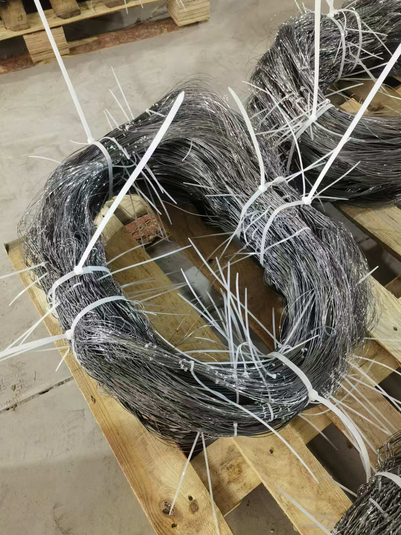 La barriera è formata dall'avvolgimento successivo di fili di diverso diametro (0,9 mm → 0,8 mm → 0,6 mm → 0,5 mm) in file. Ogni strato viene avvolto in continuo senza tagli, garantendo una copertura uniforme. Fornito con anelli di collegamento e picchetti metallici per l'ancoraggio.
